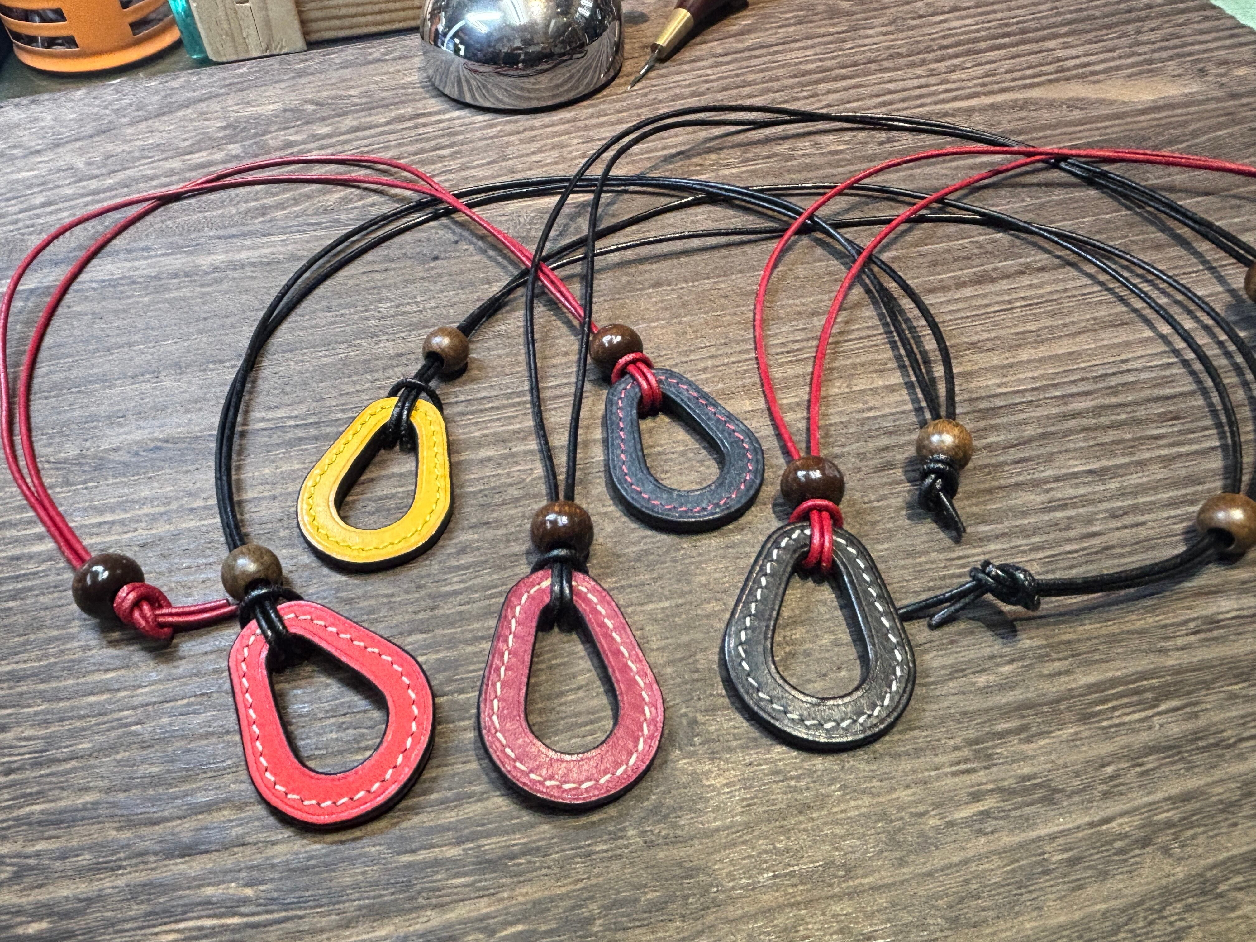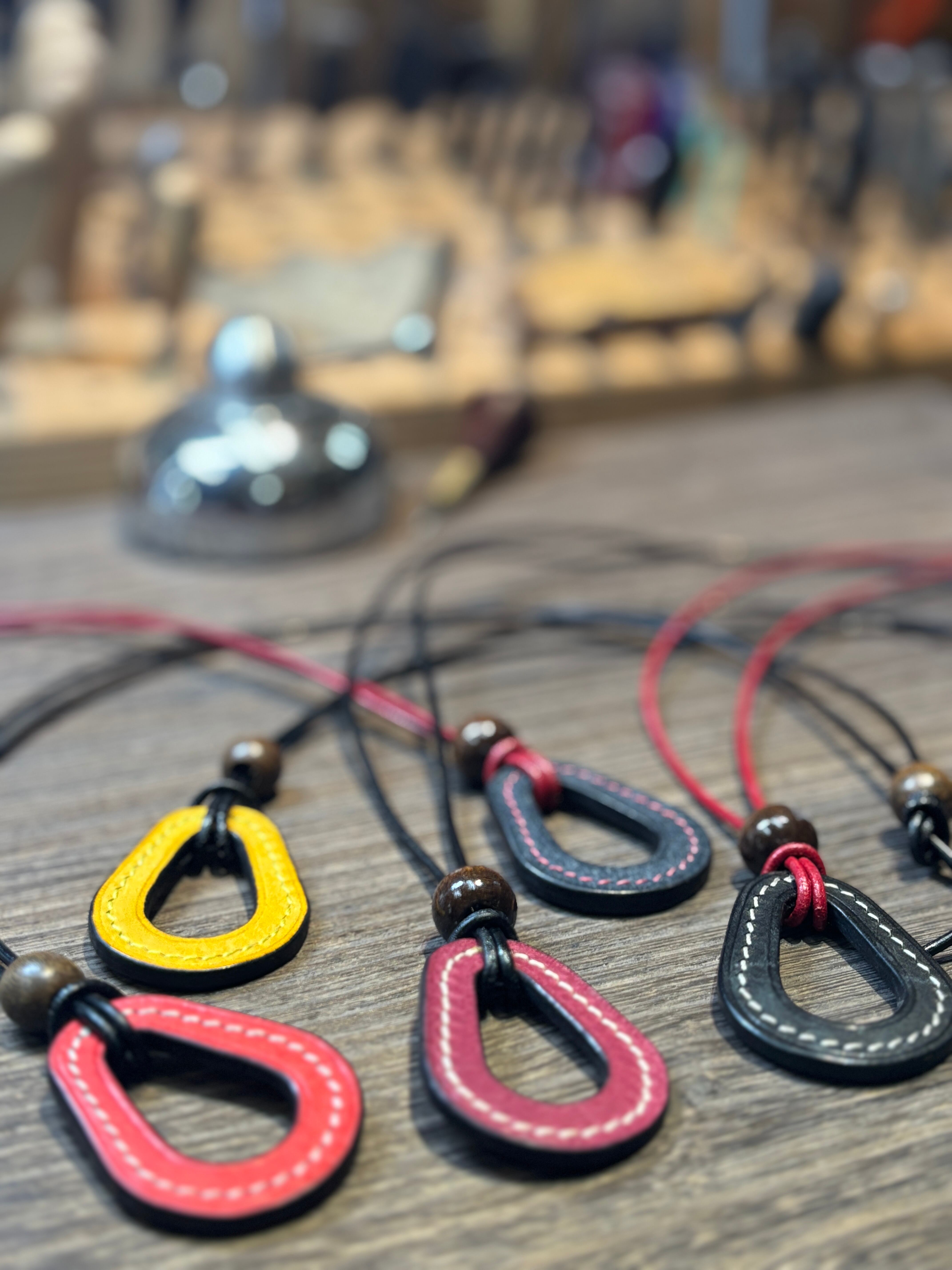 しっとりとした革の質感に、丁寧なハンドステッチが映えるデザイン。ステッチは見た目の美しさだけでなく、パーツの強度を高める役割も果たしています。ウッドビーズがさりげない温かみを添え、シンプルながらも上品な印象に仕上がりました。