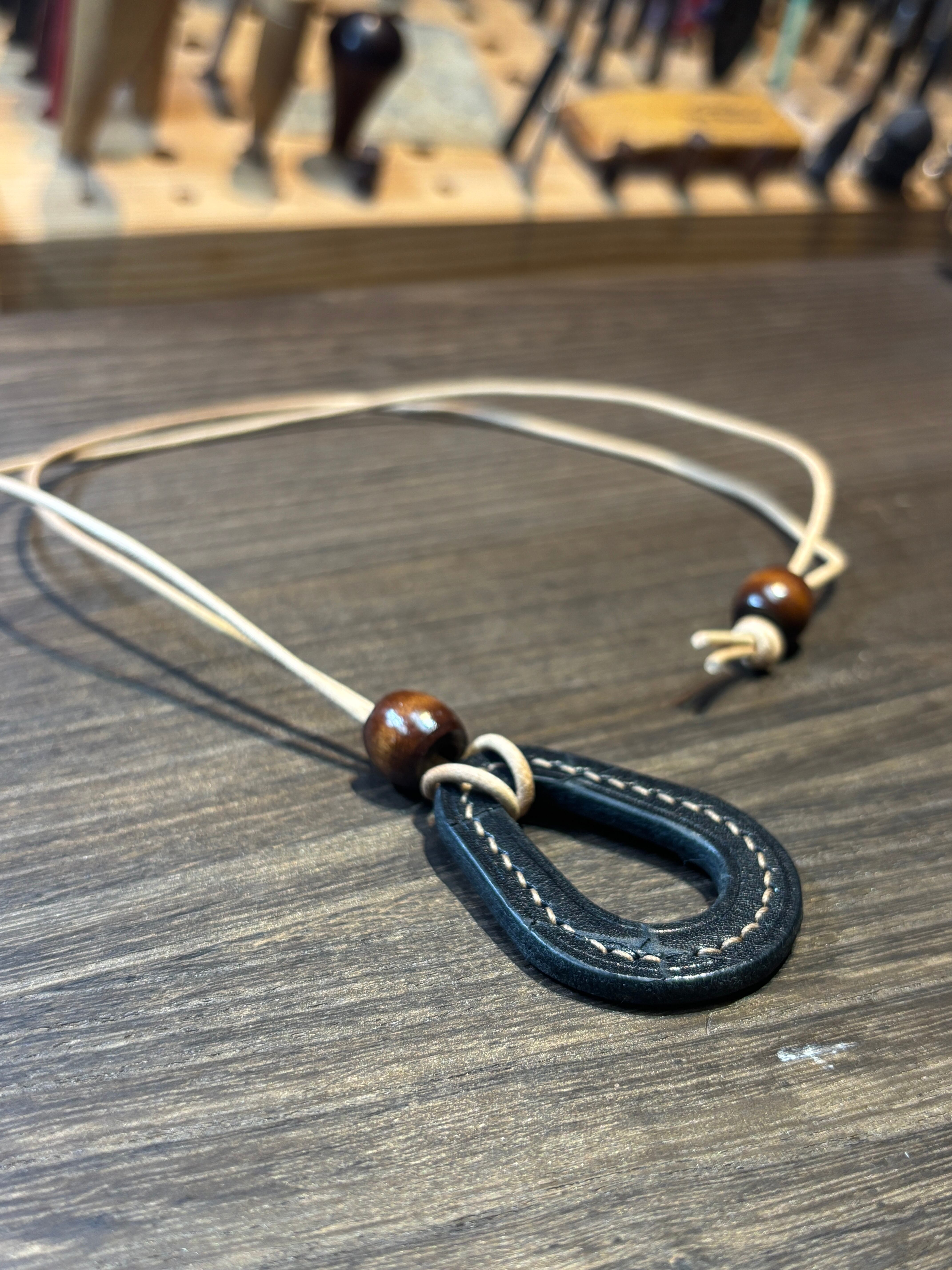 しっとりとした革の質感に、丁寧なハンドステッチが映えるデザイン。ステッチは見た目の美しさだけでなく、パーツの強度を高める役割も果たしています。ウッドビーズがさりげない温かみを添え、シンプルながらも上品な印象に仕上がりました。