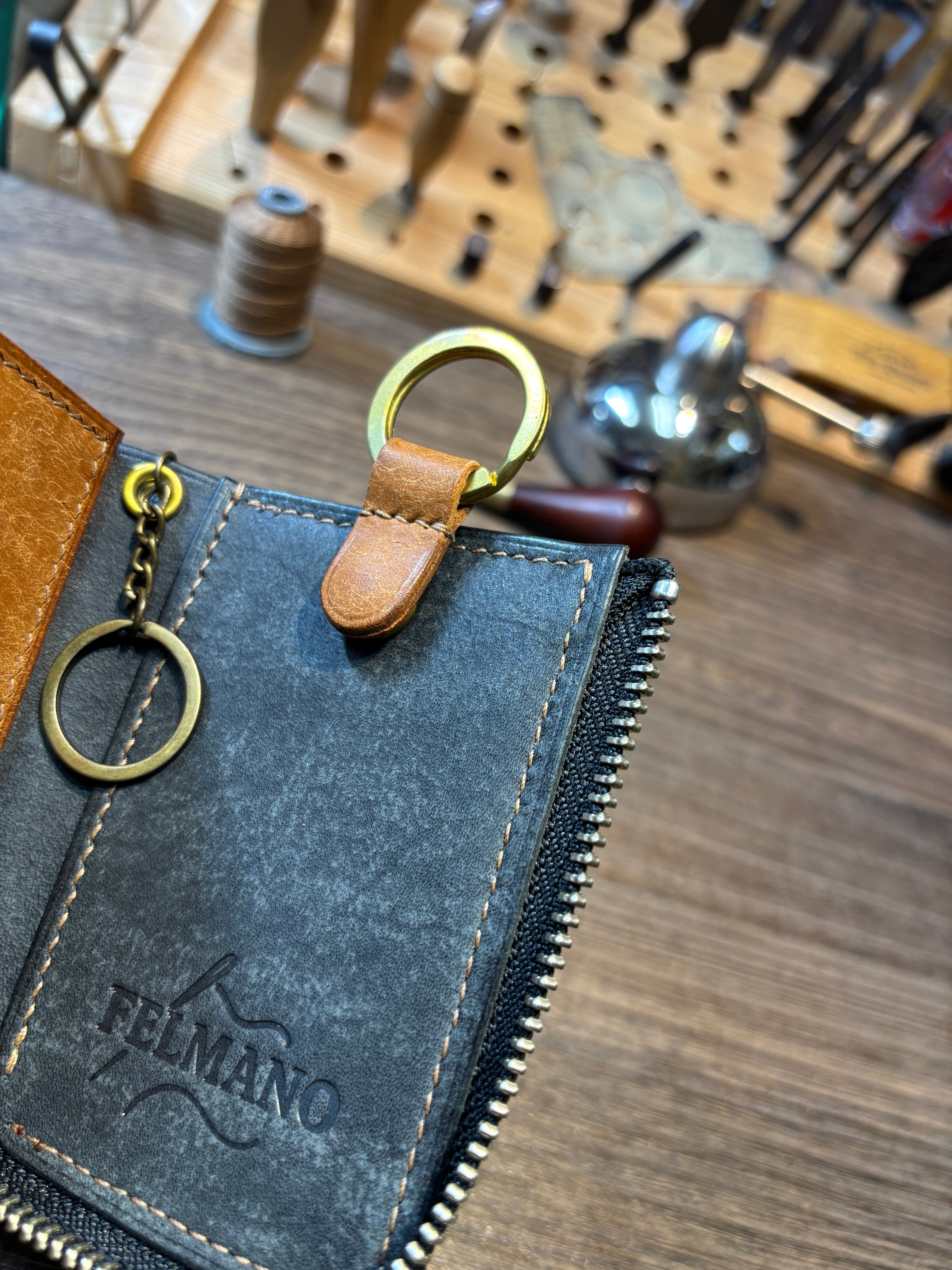 ファスナーを開くと左側には6連のキーホルダーがあり、その下に配置したレザーベルトに鍵の先端を差し込む事で鍵がガチャガチャと暴れるのを防いでくれます。