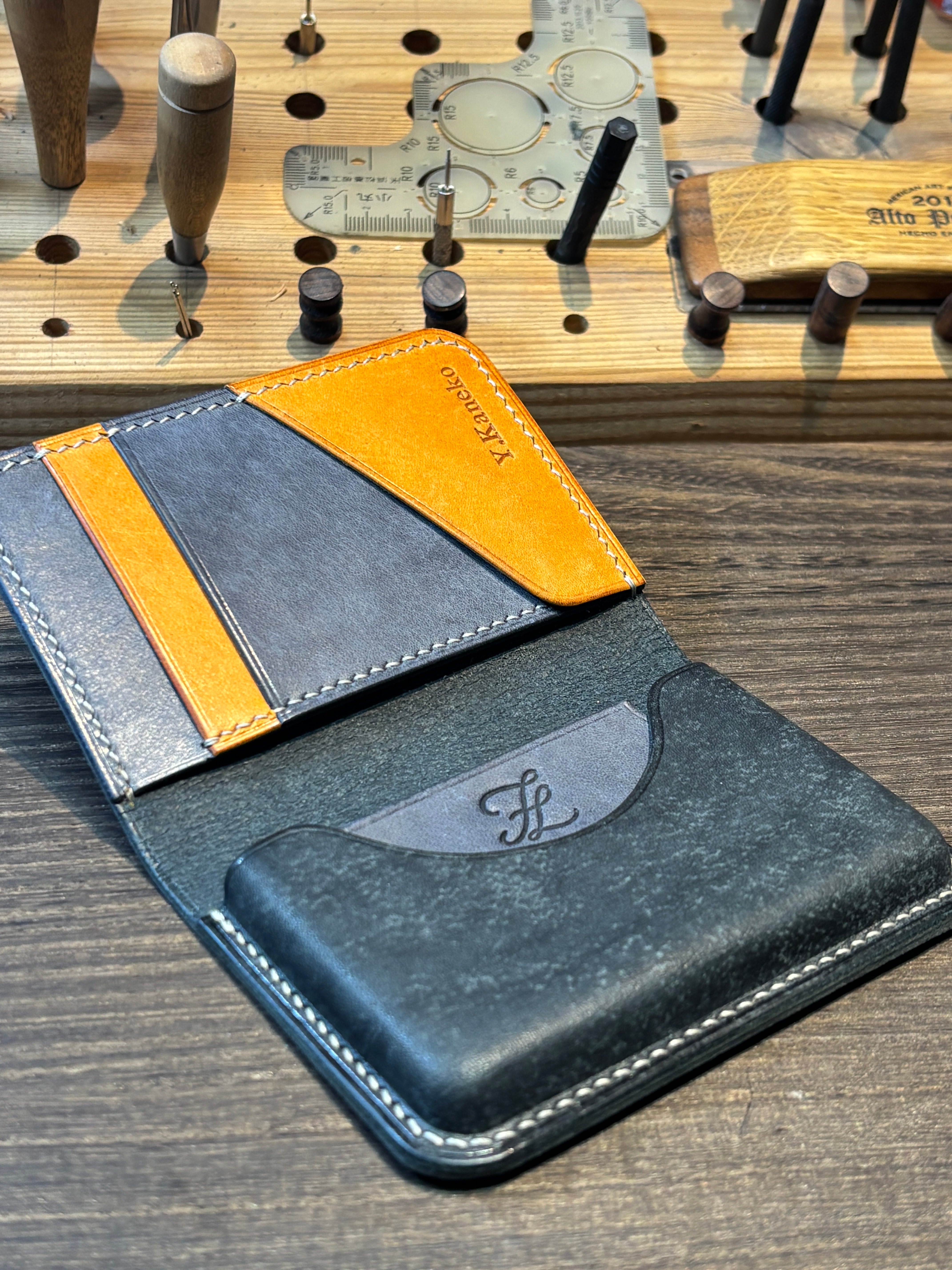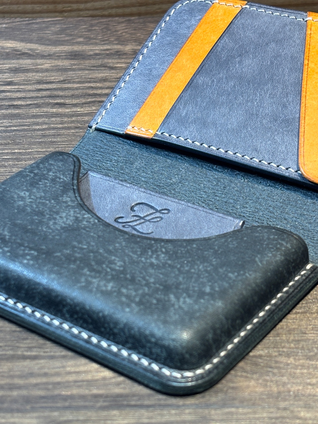 イタリア・IL ponte社のMayaのnero(ブラック)をベースに同じくMayaのブルーグレーとオレンジをアクセントにあしらった名刺入れです。