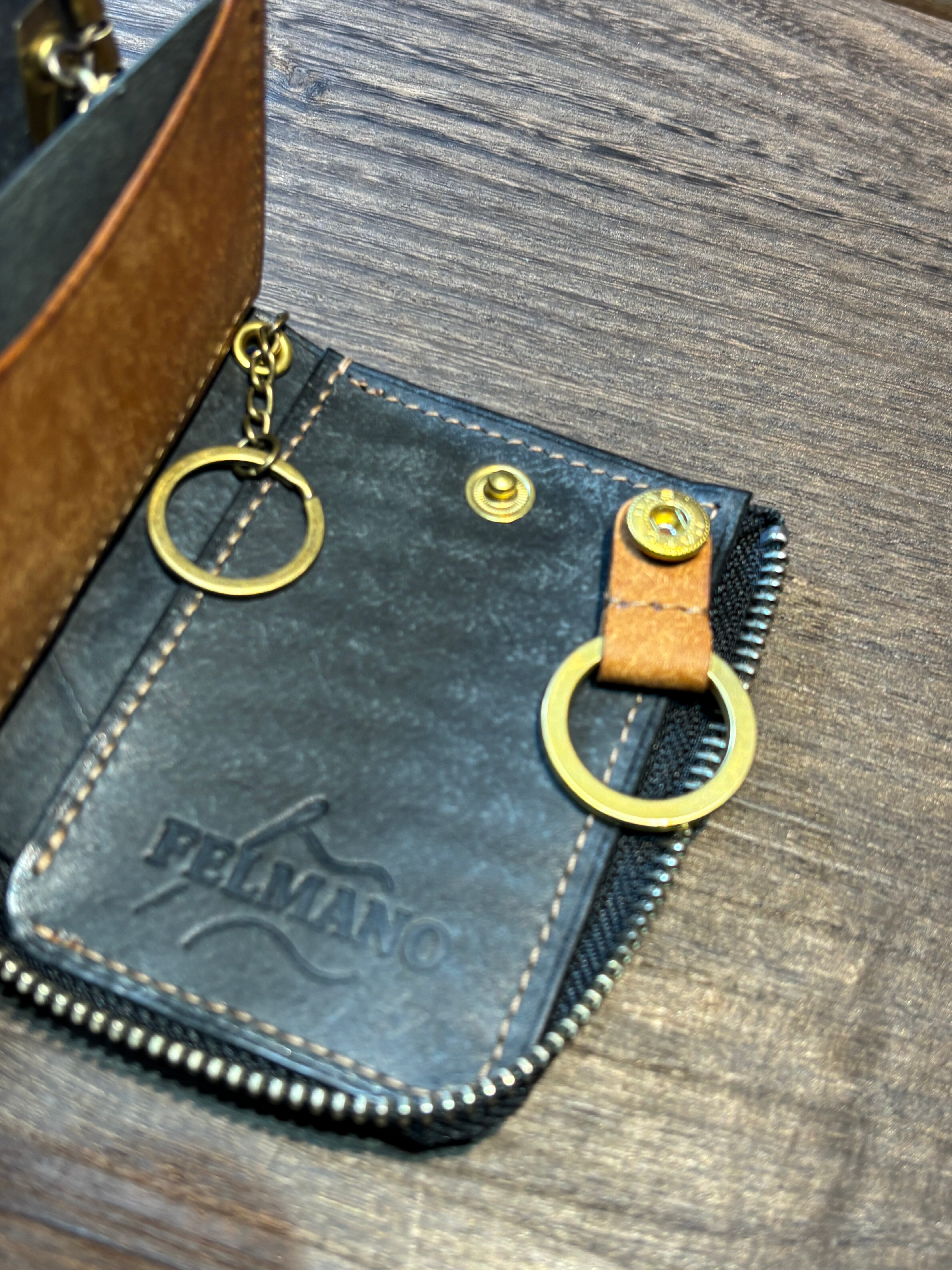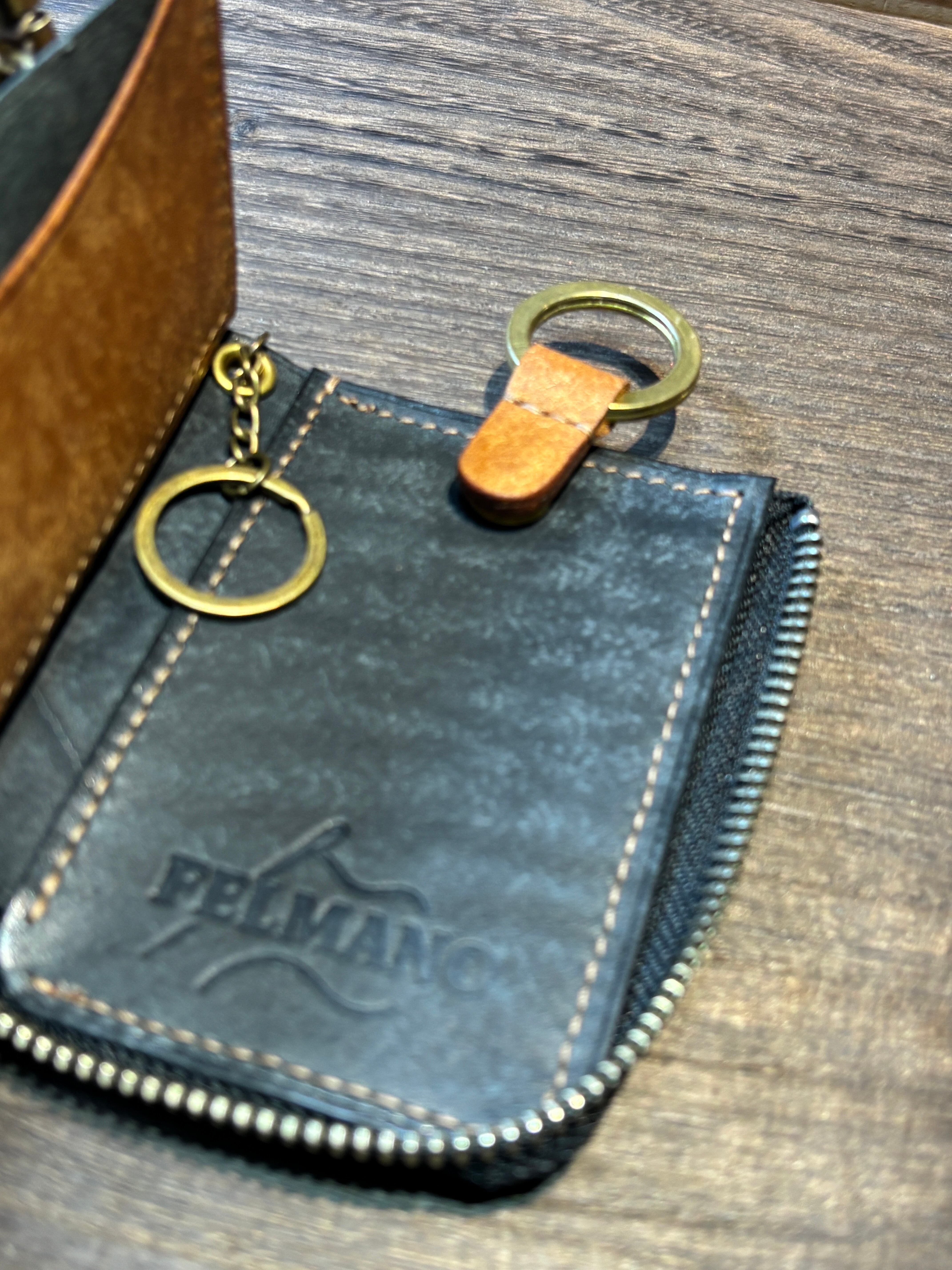 ファスナーを開くと左側には6連のキーホルダーがあり、その下に配置したレザーベルトに鍵の先端を差し込む事で鍵がガチャガチャと暴れるのを防いでくれます。