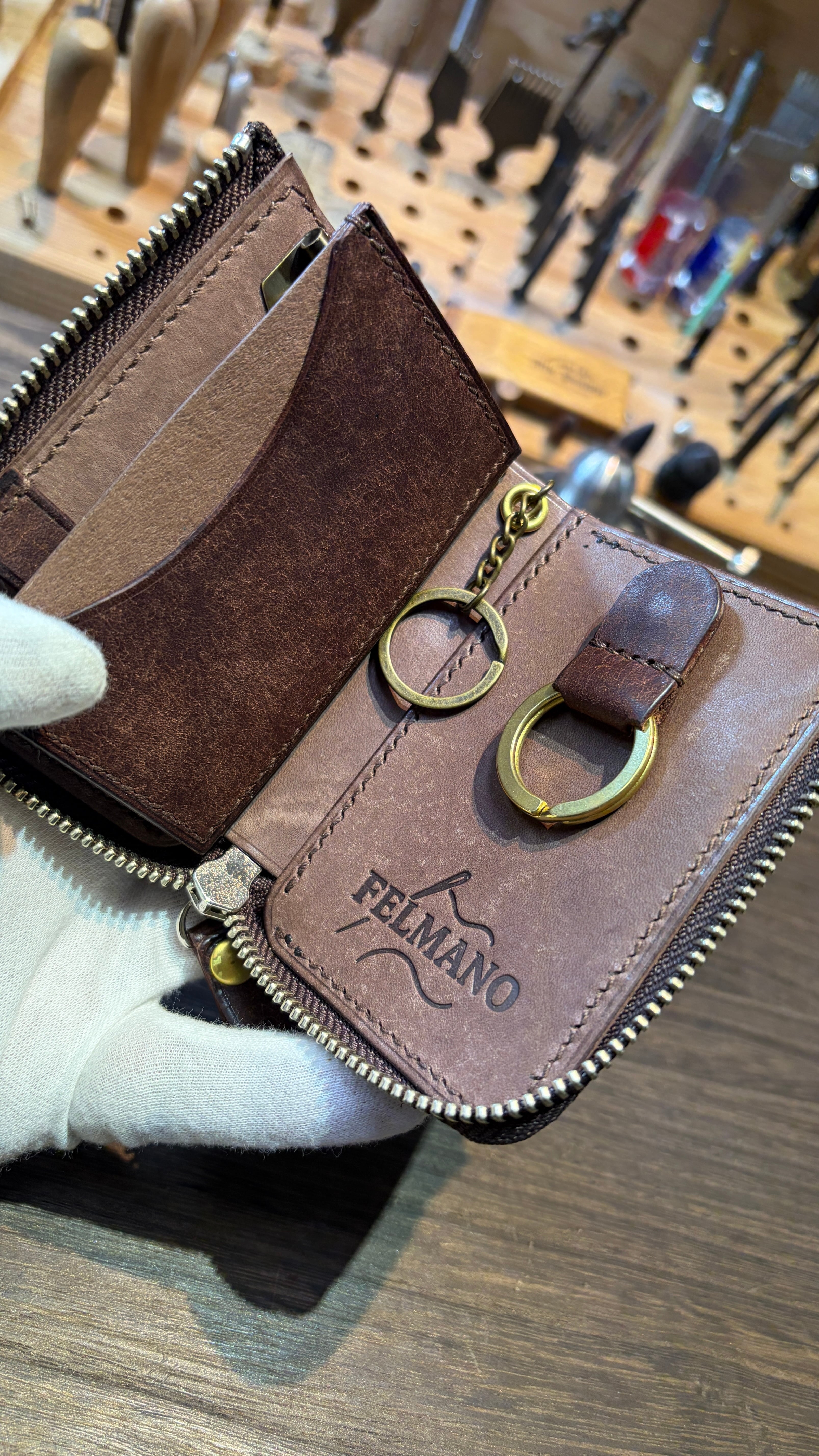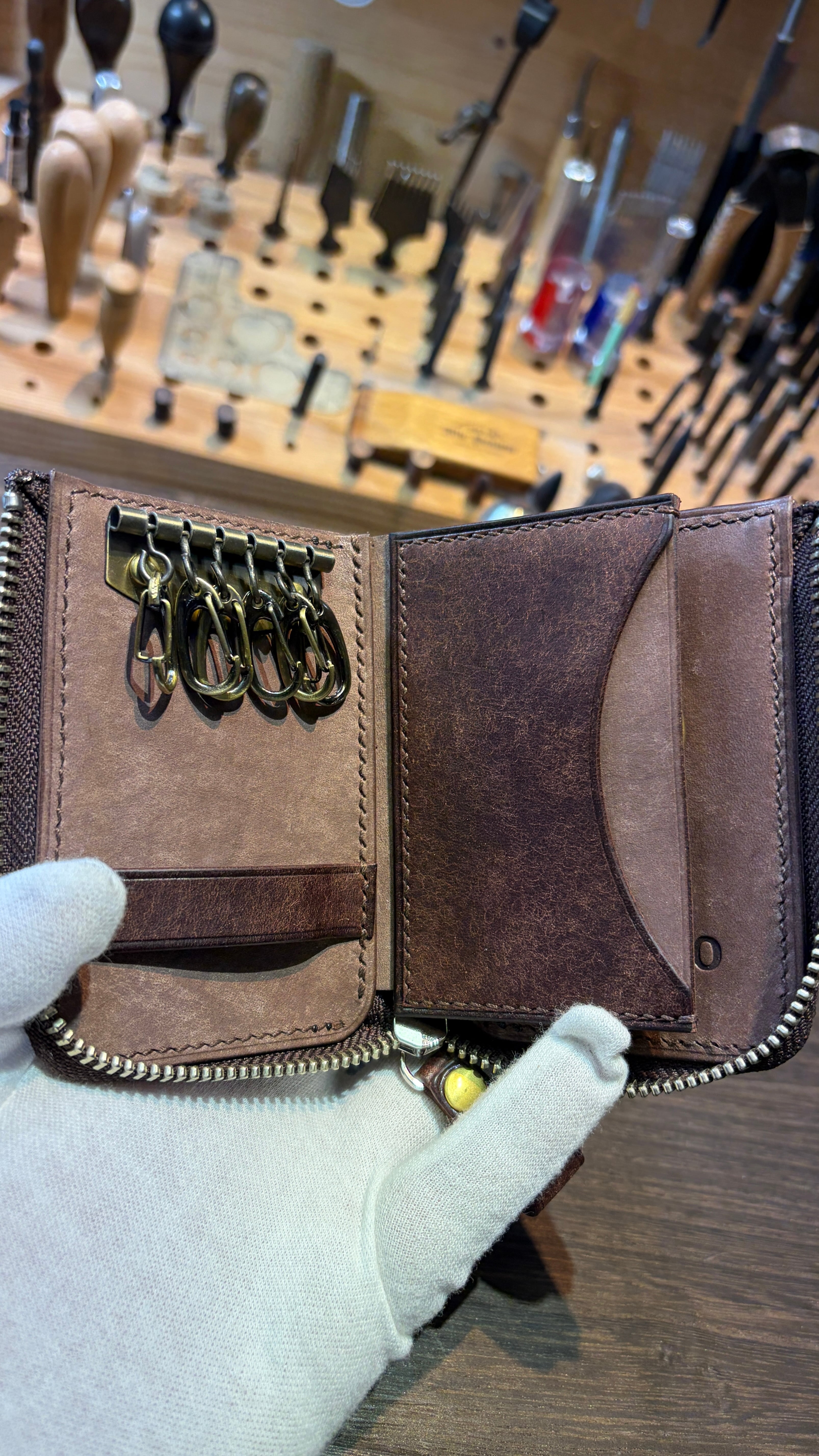 ファスナーを開くと左側には6連のキーホルダーがあり、その下に配置したレザーベルトに鍵の先端を差し込む事で鍵がガチャガチャと暴れるのを防いでくれます。