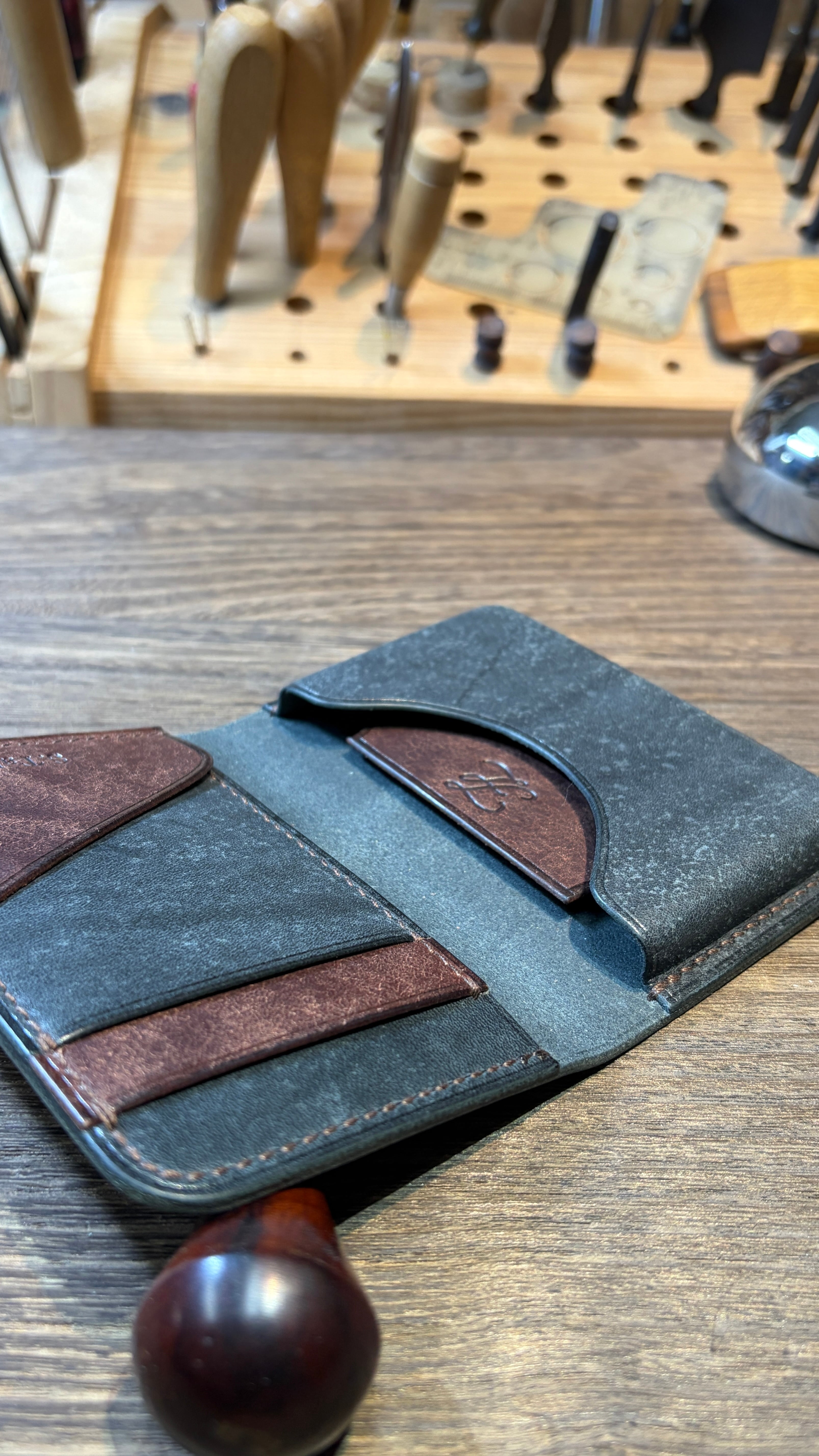 イタリア・IL PONTE社のMaya、ブラックをベースに同じくイタリアンレザー、プエブロのtobacco(ダークブラウン)をアクセントにあしらった名刺入れです。