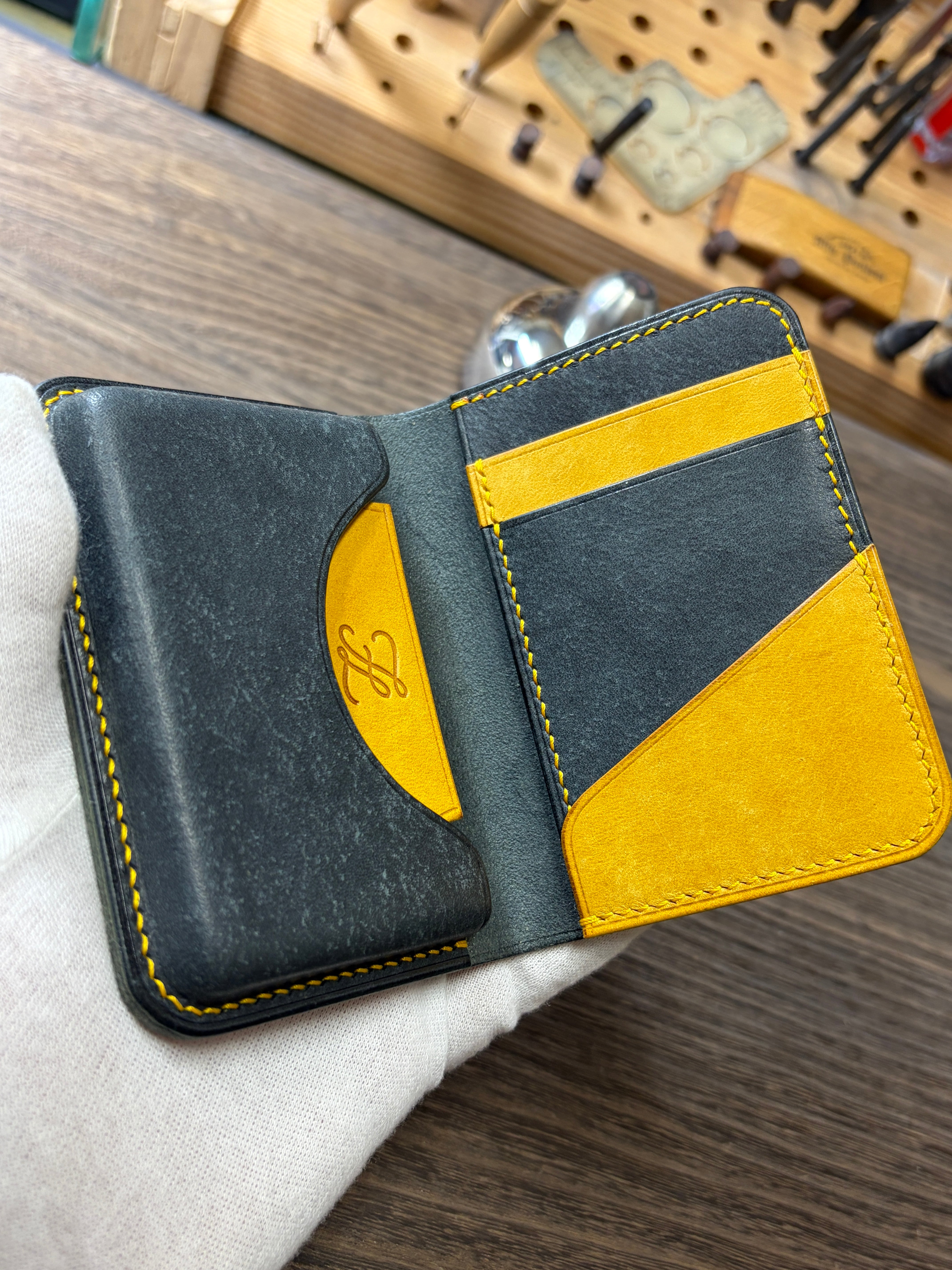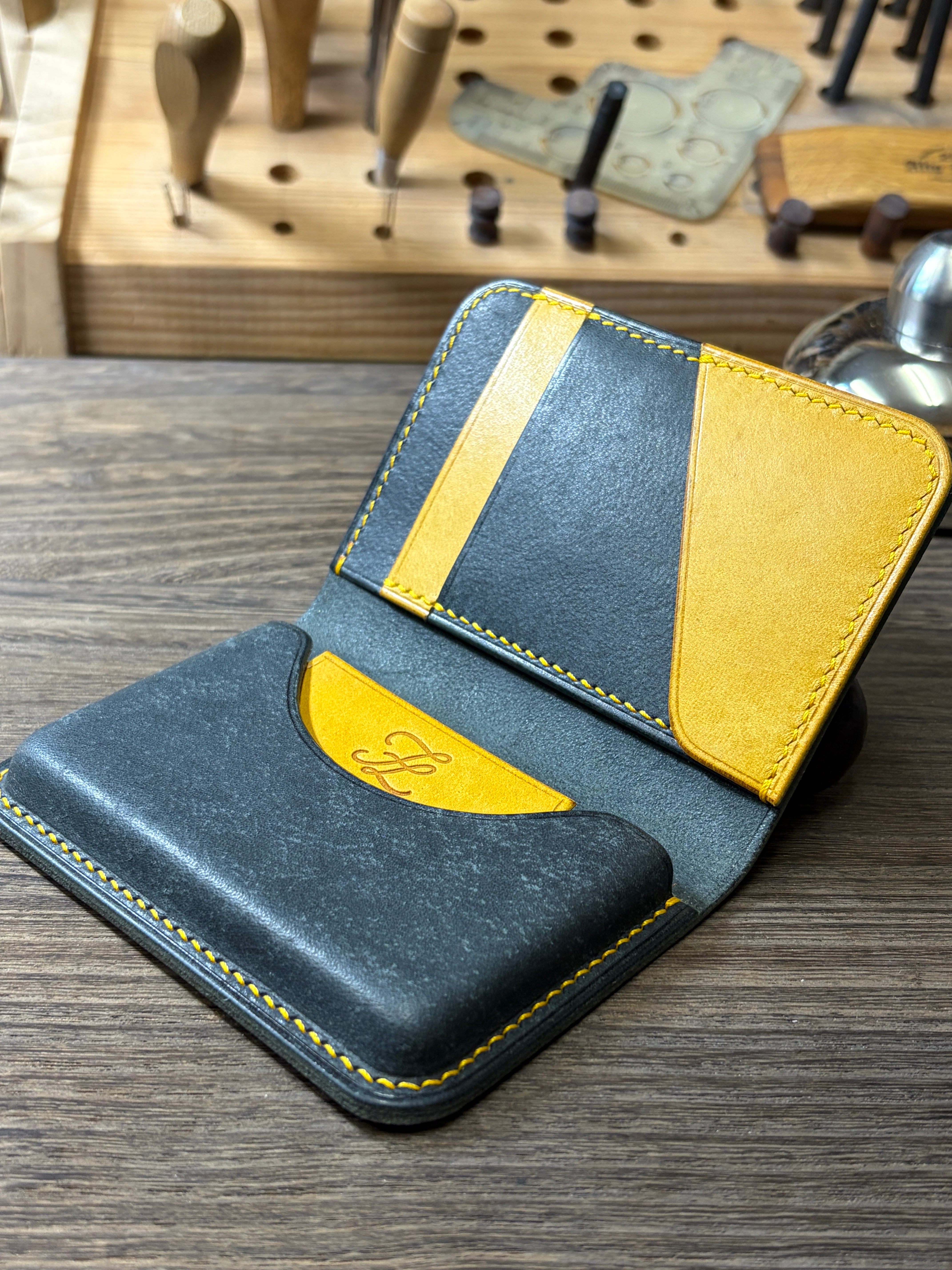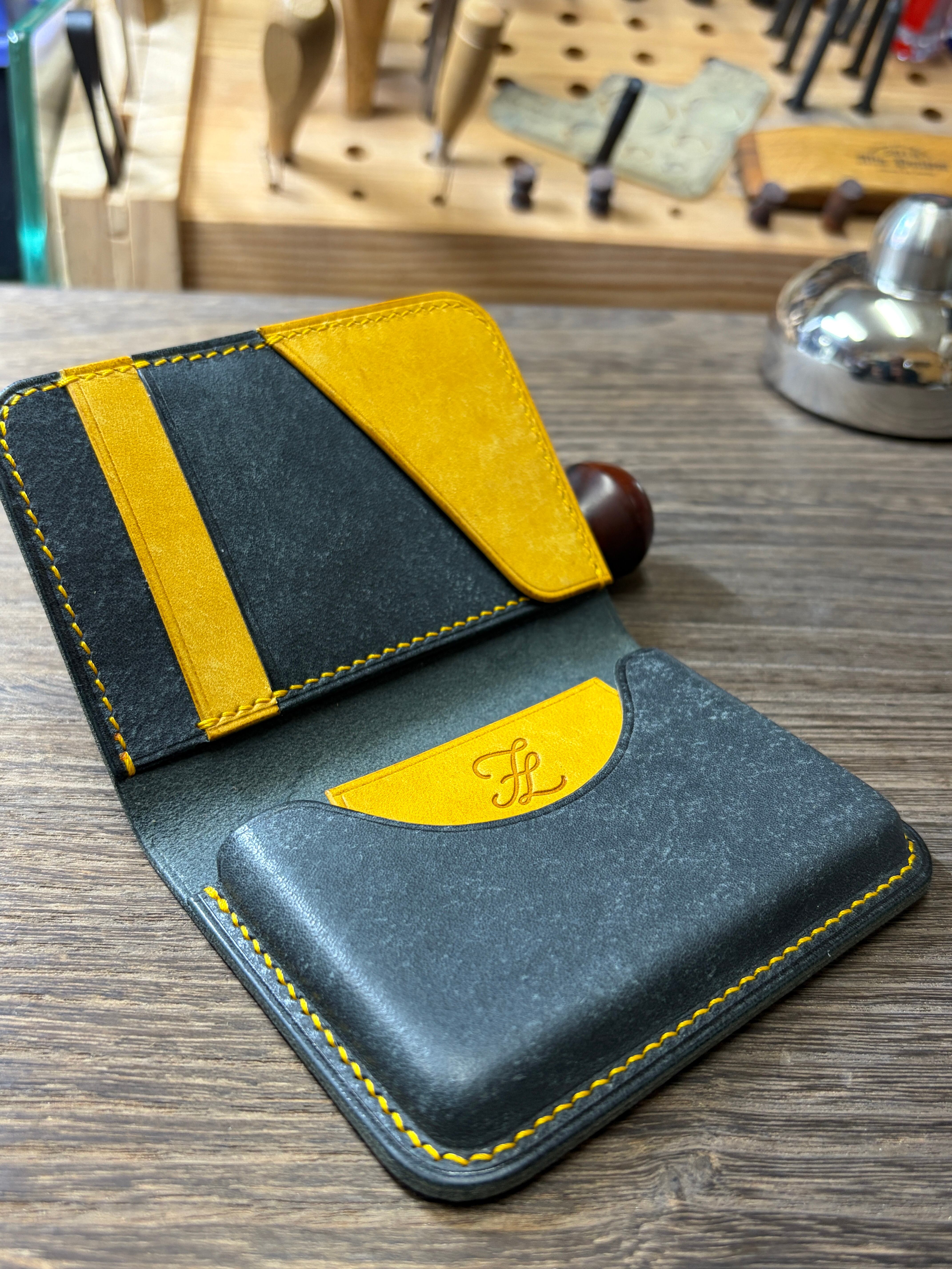 本革 名刺入れ ハンドメイド 【FELMANO】 レザー カードケース バイカラー black×yellow 経年変化