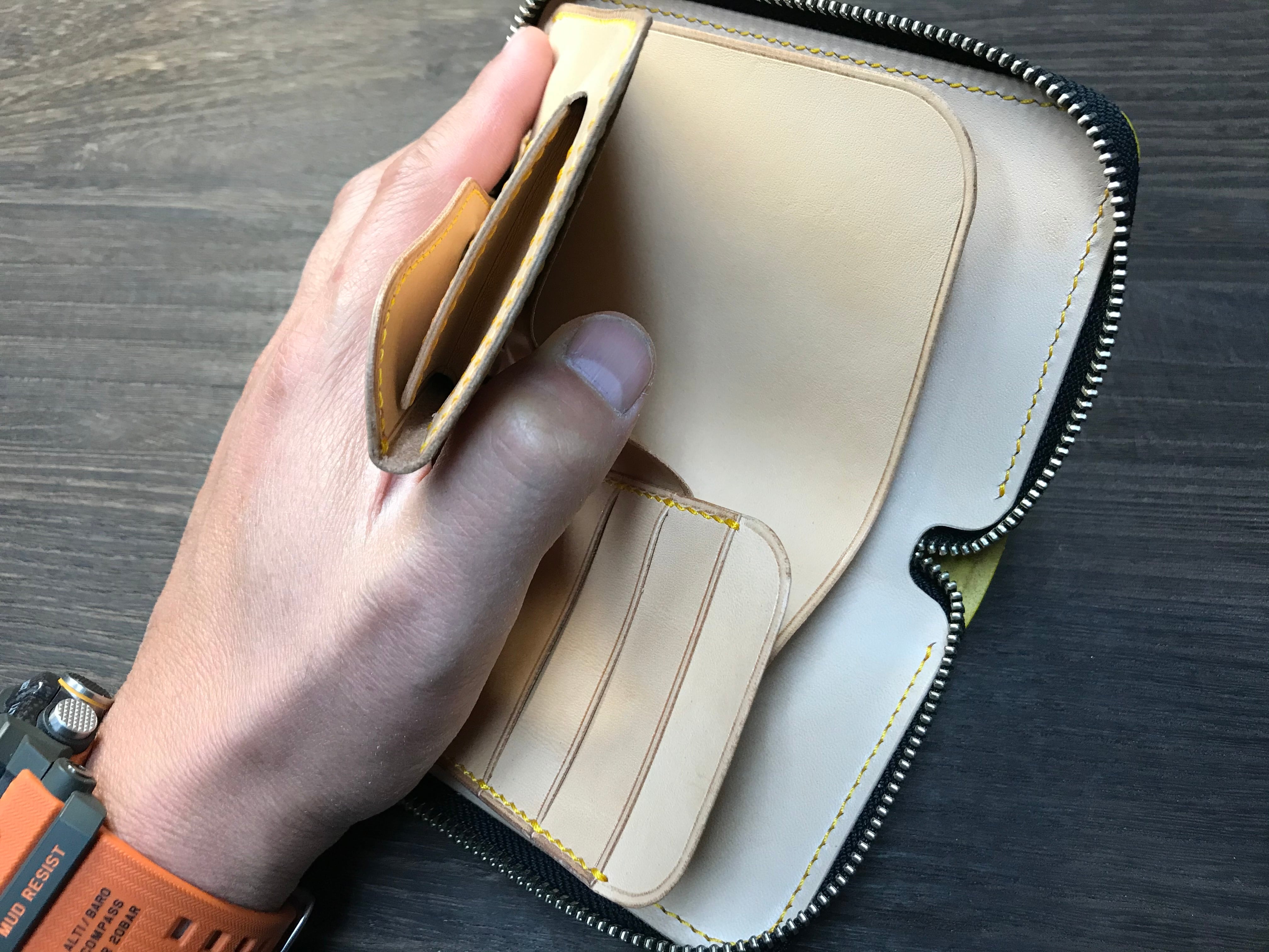 サイズはミドルサイズとなっており、ロングウォレットさながらの収納力と、シュートウォレットに近い手軽さを持ち合わせております。