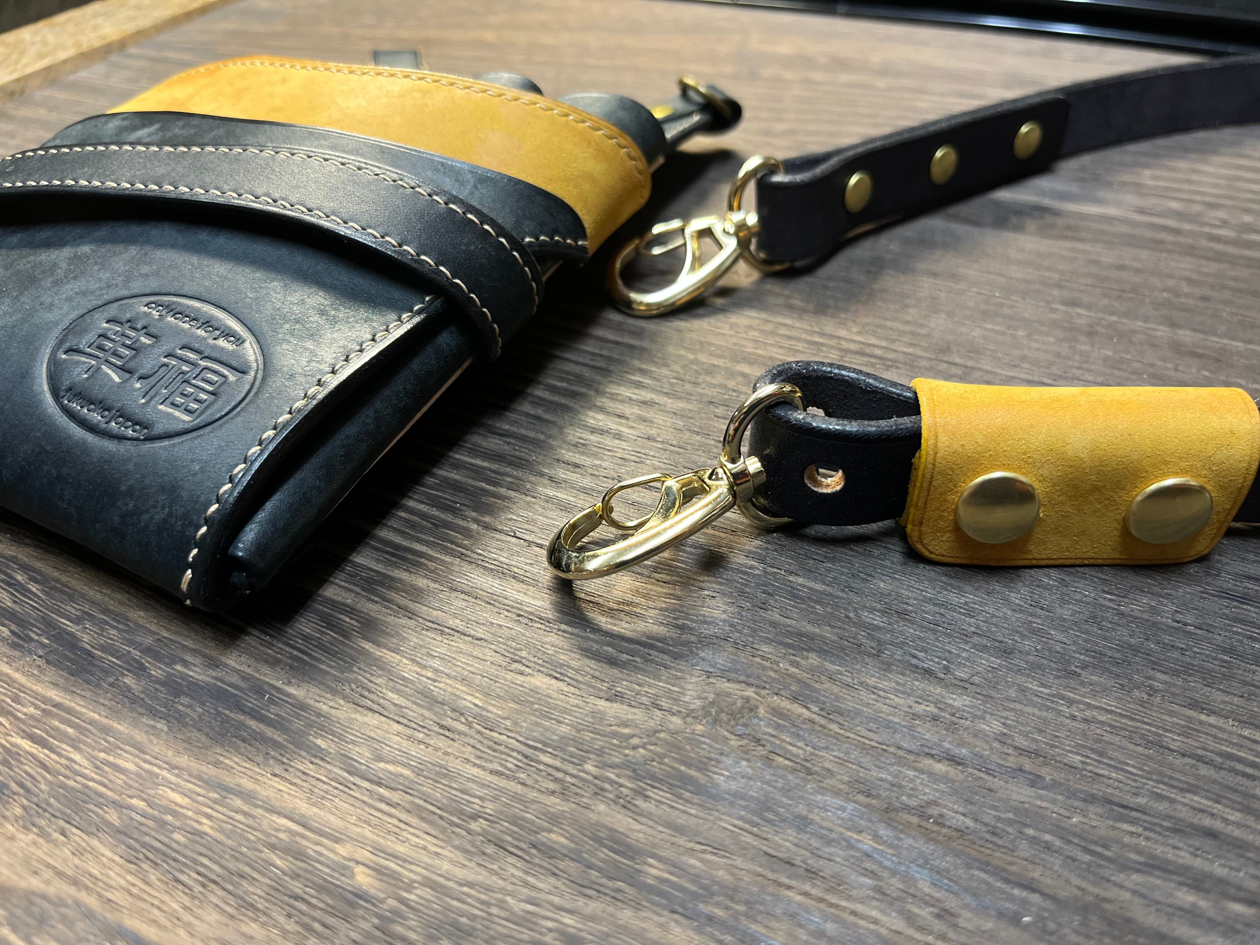 黒と黄色のバイカラーのボディには真鍮製のホックが光り、レザー、金具共にその成長を目の当たりにする事が出来るアイテムとなっています。