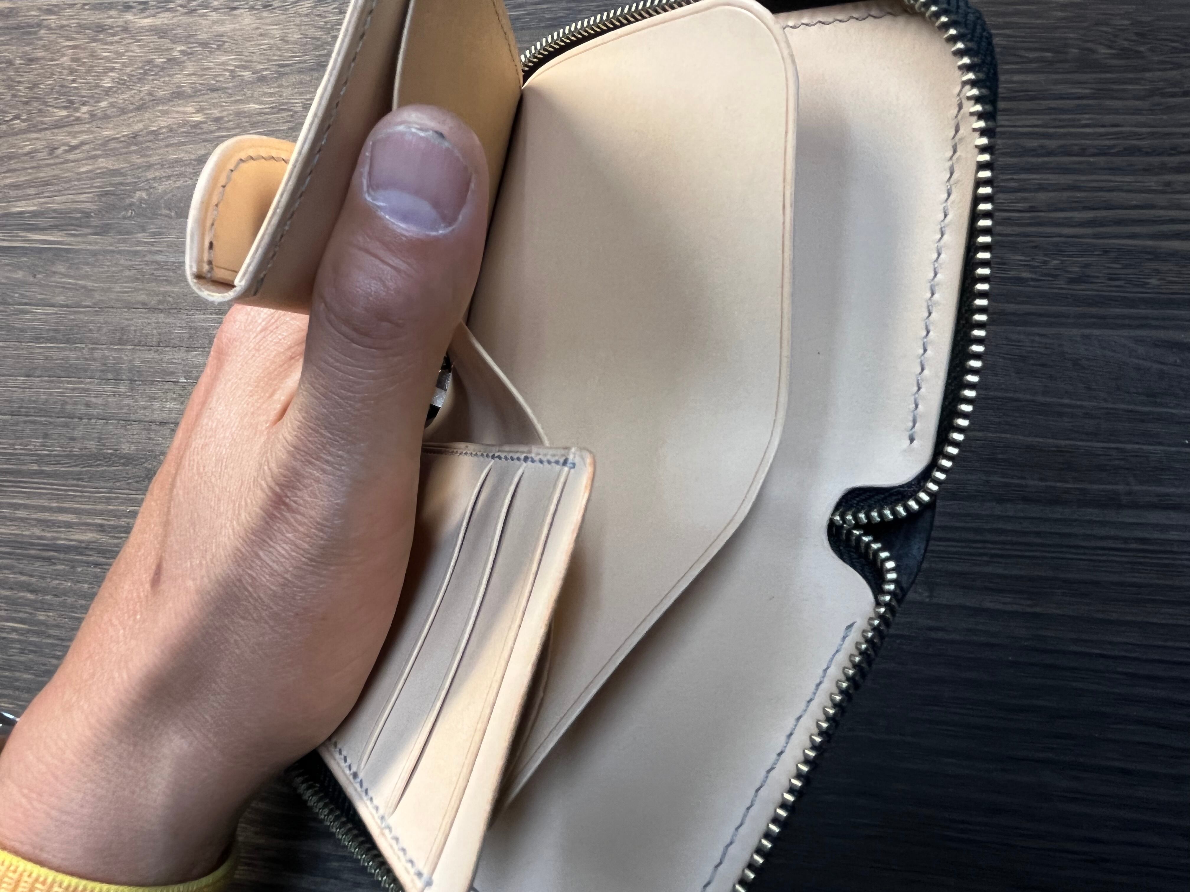 内装はナチュラルのヌメ革をオイル仕上げにて仕立てております。